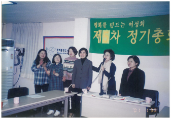 2001년 1월 30일(화) 오후 5시, 여성사회교육원 3층 청산교육장에서 개최된 5차 정기총회 사진. 새로이 선임된 대표단을 소개하고 있다.