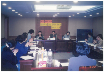 2001년 3월 22일(목), 14:00. 세종문화회관 전략회의실에서 '급변하는 우리의 대응'이라는 제목으로 개최된 제4회 여성평화통일포럼에서 발표자와 참석자들이 토론하고 있다.