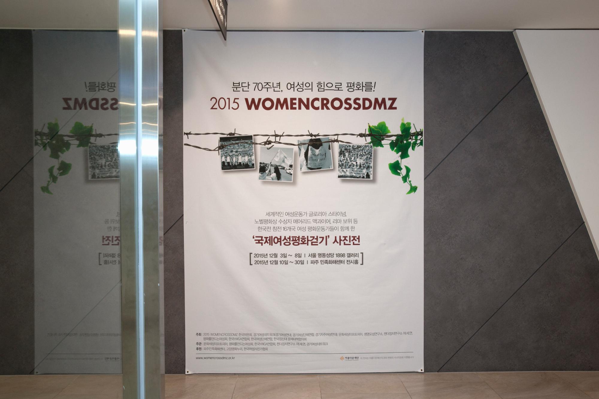 2015년 5월, 30여 명의 세계여성평화운동가들이 한반도의 DMZ를 횡단했던 WomenCrossDMZ 행사를 사진 기록으로 남기기 위해 WCD한국측 실행위가 중심이 되어 명동성당 1898 갤러리에서 2015년 12월 3일부터 12월 8일까지 개최하였다. 내용을 알리는 배너.