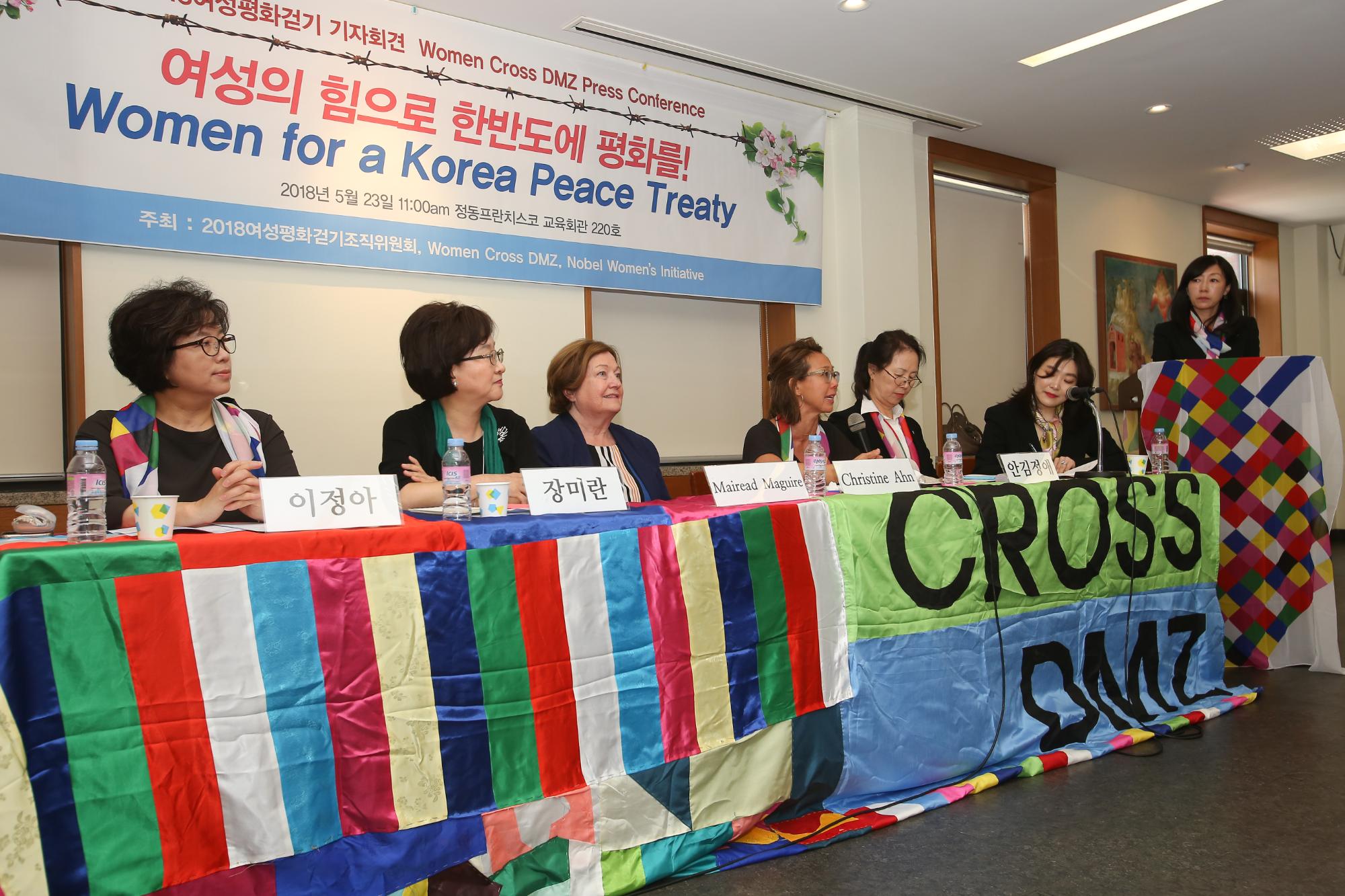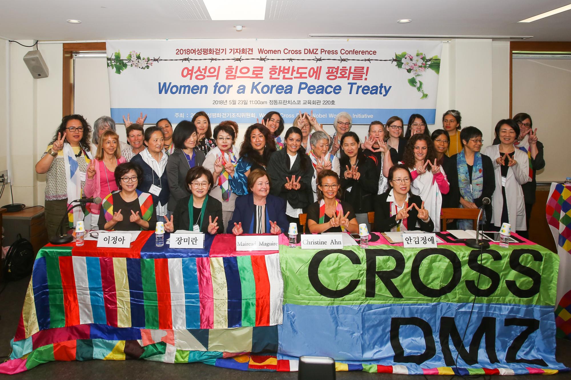 2018년 5월 23일 오전 11시, 정동 프란치스코 교육회관 220호에서 열린 2018 여성평화걷기 기자회견 사진. 개최 내용을 설명하는 대표단과 참가자들의 기념 사진.