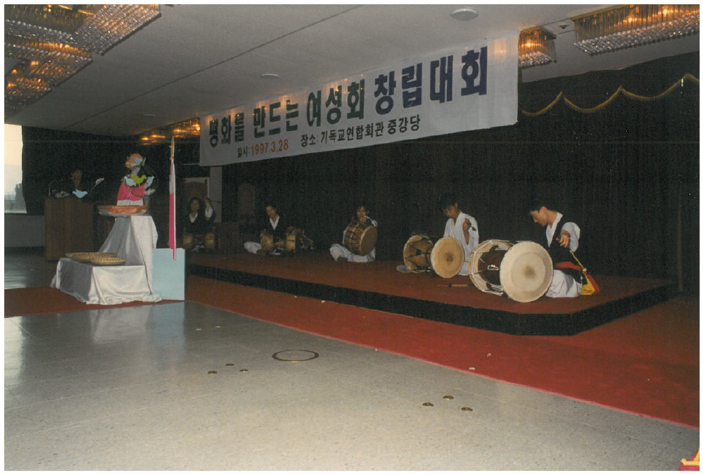 1997년 3월 28일(금). 오후 2시. 기독교연합회관 4층 중강당에서 개최된 평화를만드는여성회 창립대회 사진. 창립 선언문 - "여성의 힘으로 민족의 평화와 통일을 실현하고 나아가 아시아와 전 세계의 평화를 만들어 가자"라는 기치 아래 하나로 모인 여성들이 오늘 '평화를만드는여성회'를 창립하게 되었다- 인사말을 하는 이우정 준비위원장의 모습과 축하공연 모습.