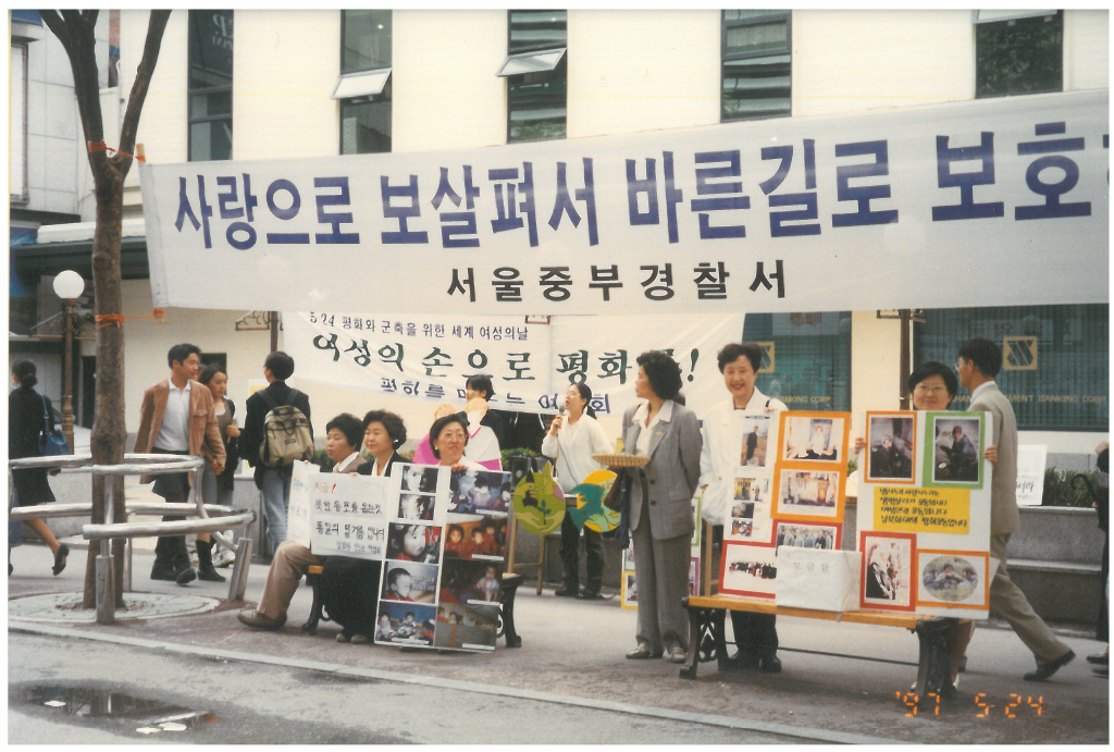 97년 5월 24일에 세계여성평화군축의 날 기념행사의 일환으로 중부경찰서 앞에서 본 회 회원들이 주최한 북한동포 돕기 거리모금 행사 모습.