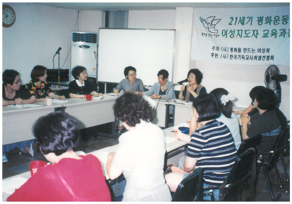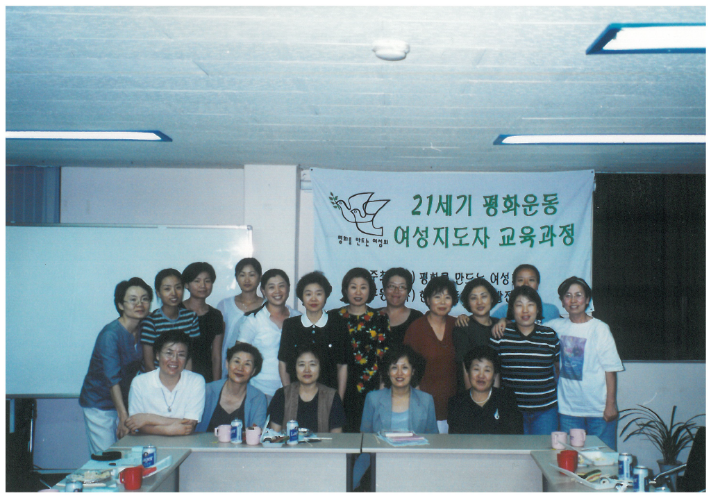 1999년 6월 7일~8월 9일에 개최된 제1기 21세기 평화운동 여성지도자 교육(주 1회) 수료식 참가자들.