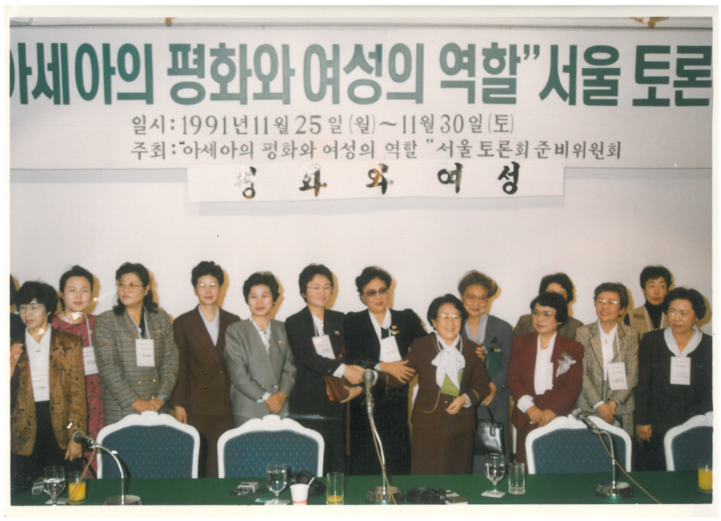1991년부터 1992년, 남북여성들은 판문점을 넘나들면서 한반도의 평화를 위해 분단장벽을 넘는 역사의 대장정을 시작했다. 사진은 1991년 11월 25일(월)~11월 30일(토), 서울 라마다 올림피아 호텔에서 열린 '아세아의 평화와 여성의 역할' 서울 토론회의 단체사진이다.