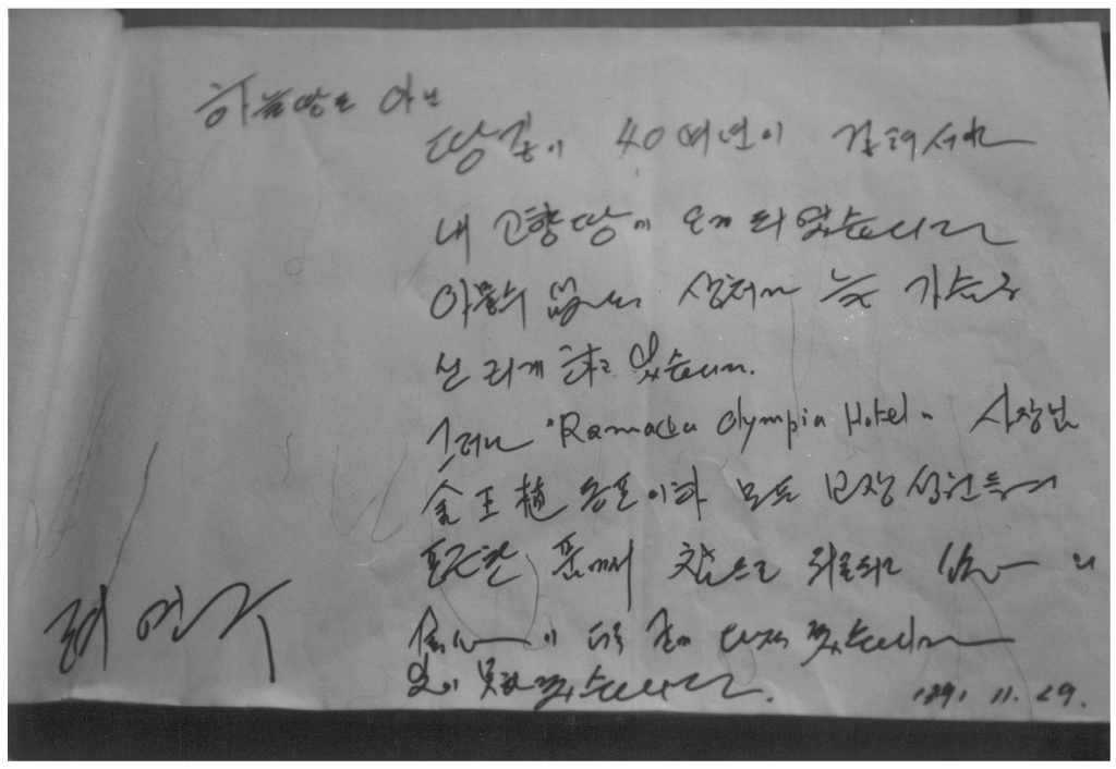 1991년부터 1992년, 남북여성들은 판문점을 넘나들면서 한반도의 평화를 위해 분단장벽을 넘는 역사의 대장정을 시작했다. 사진은 북측 대표단 려연구(여운형의 딸)가 남측행사단에 자필로 쓴 편지.